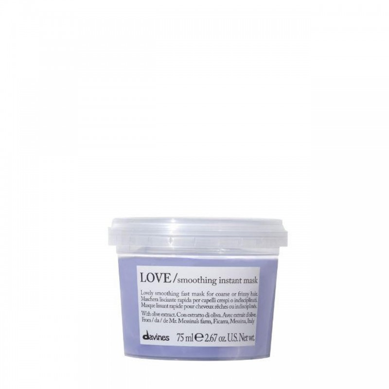 Davines Love Smoothing Instant Mask è una maschera lisciante rapida adatta ai capelli crespi o indisciplinati. La sua texture cremosa districa con facilità senza appesantire il capello. Contiene ingredienti naturali tra cui l'estratto di Oliva di Minuta ricco di acidi grassi che favoriscono l'idratazione e la conseguente morbidezza del capello. Permette di addolcire e legivare le cuticole. ha un'immediata azione anti-crespo eaiuta a ridurre il volume indesiderato facilitando la stiratura con un tempo di posa di soli 30 secondi. La linea Davines dà la priorità agli ingredienti naturali e cerca di minimizzare l'impatto sul pianeta (packaging a impatto zero, Plastic Bank, produzione con energia pulita al 100%).