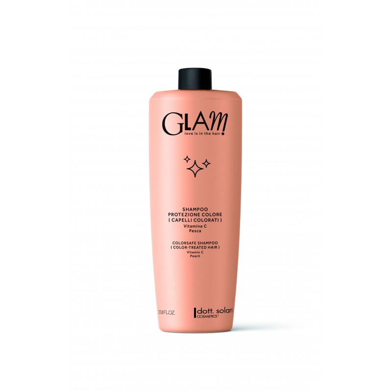 dott. solari COSMETICS Glam Colorsafe Shampoo è uno shampoo protettivo idratante ideale per capelli colorati, secchi e danneggiati. La sua formula deterge delicatamente mentre ripristina l'idratazione e protegge il colore dallo sbiadimento. Contiene estratto di pesca e Vitamina C che nutrono e rinforzano il capello svolgendo un'azione emolliente e levigante prolungando la durata e brillantezza del colore nel tempo. La sua texture cremosa e il profumo fruttato avvolgono la chioma, donando morbidezza, lucentezza e vitalità.