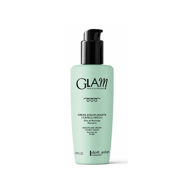 dott. solari COSMETICS Glam Crema Discipline Cream Curly Hair una crema balsamo disciplinante leave-in studiata per la cura di capelli ricci, mossi o indisciplinati. La formula arricchita con Olio di Moringa, dalle proprietà nutrienti e antiossidanti, e Estratto di Zenzero, che rinforza e rivitalizza la fibra capillare, assicura un effetto disciplinante e un aspetto sano e luminoso.Nutre e definisce i ricci, controlla il crespo e migliora l'elasticità, lasciando la chioma morbida, setosa e leggera senza appesantire.