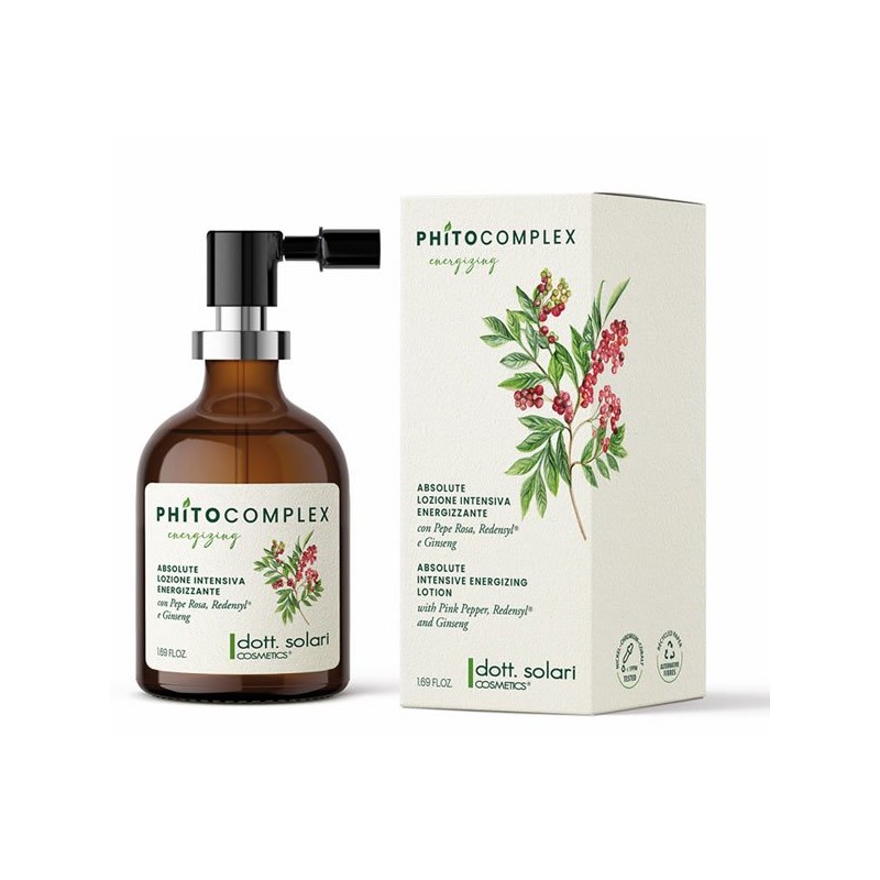 dott. solari COSMETICS Phitocomplex Energizing Absolute Intensive Lotion è un trattamento intensivo spray studiato per rinforzare il cuoio capelluto e stimolare la crescita dei capelli fragili e soggetti a caduta. La sua formula ricca di estratti naturali come ginseng, pepe rosa e l'innovativo complesso Redensyl, aiuta a contrastare efficacemente l'indebolimento dei capelli e a promuovere il ricambio cellulare, migliorando la salute del cuoio capelluto. La sua texture leggera viene completamente assorbita senza lasciare residui. Senza risciacquo.