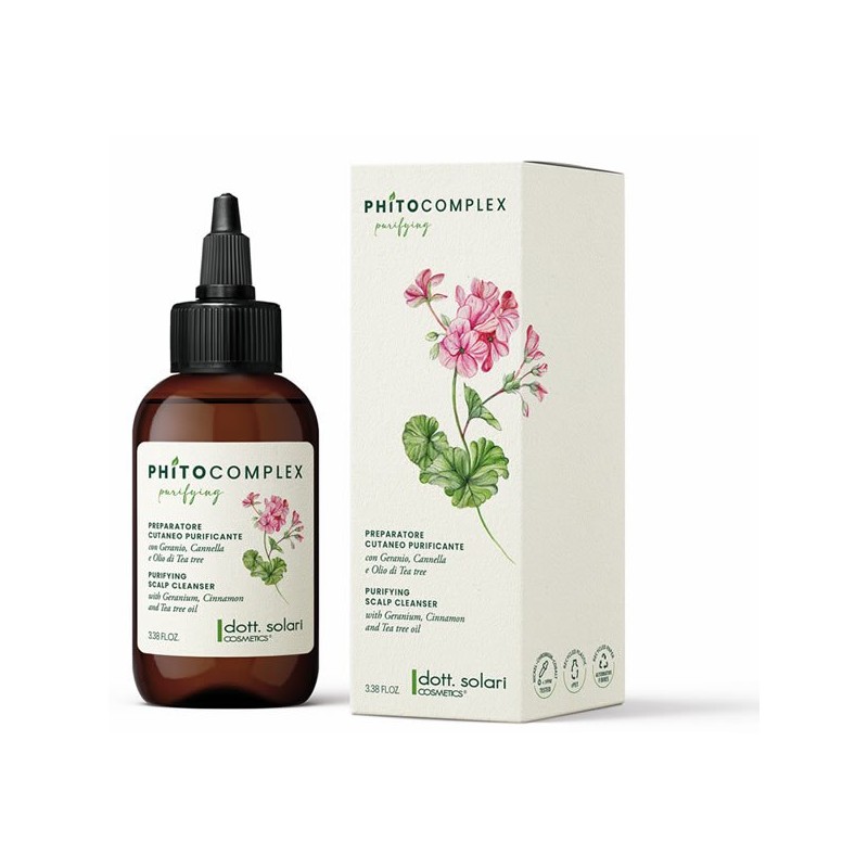 dott. solari COSMETICS Phitocomplex Purifying Scalp Cleanser è una lozione detergente specifica per il cuoio capelluto che purifica in profondità e riequilibrare la pelle sensibile o soggetta a irritazioni. Contiene estratto di Geranio e Cannella con Olo di Tea Tree agisce efficacemente per rimuovere impurità, eccesso di sebo e residui, aiutando a prevenire la formazione di forfora sia secca che grassa. Il cuoio capelluto risulta riequilibrato, lenito e fresco, riducendo fastidi come prurito e arrossamenti e promuovendo un ambiente sano per la crescita di capelli più forti e vitali.