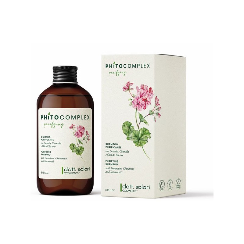 dott. solari COSMETICS Phitocomplex Purifying Shampoo è uno shampoo purificante formulato per la cura del cuoio capelluto e contrastare la forfora grassa e secca. Deterge delicatamente eliminando impurità e residui, rispettando l'equilibrio naturale della cute. Contiene estratto di geranio e cannella, noti per le loro proprietà purificanti e antiforfora, uniti all'olio di tea tree, che svolge un'azione antibatterica e antifungina. Questa combinazione aiuta a mantenere il cuoio capelluto sano, fresco e libero da irritazioni, favorendo un ambiente equilibrato e prevenendo la formazione di forfora.