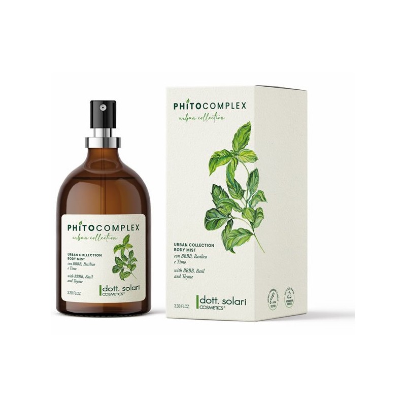 dott. solari COSMETICS Phitocomplex Urban Collection Body Mist è una lozione spray corpo leggera e rinfrescante, ideale per donare una sensazione immediata di pulito e benessere durante la giornata. Contiene basilico e timo, dalle note proprietà antiossidanti, antibatteriche e purificanti, insieme all'innovativa molecola BBBB (Actiscents) che neutralizza i microrganismi responsabili dei cattivi odori, prevenendone la formazione. Adatta a chi vive in ambienti urbani o inquinati, aiuta a contrastare gli effetti dello smog sulla pelle, lasciandola fresca, tonificata e delicatamente profumata.