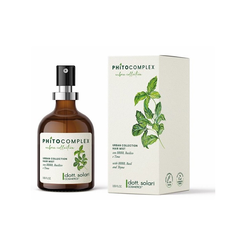 dott. solari COSMETICS Phitocomplex Urban Collection Hair Mist è uno spray leggero e senza risciacquo ideale per rinfrescare, deodorare e proteggere i capelli tra un lavaggio e l'altro. Contiene basilico, timo e la molecola innovativa BBBB (Actiscents™), una tecnologia brevettata integrata nella profumazione che neutralizza i microrganismi responsabili dei cattivi odori, prevenendone la formazione. Contrasta gli effetti dell'inquinamento urbano, dona una sensazione immediata di pulito e freschezza senza appesantire la chioma. Perfetto per chi vive in ambienti urbani o per chi desidera mantenere i capelli freschi.
