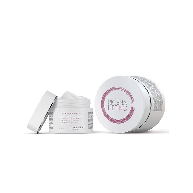 dott. solari COSMETICS Rigena Lifting Intensive Mask è una maschera ristrutturante intensiva ideale per capelli stressati, sensibilizzati o sottoposti a trattamenti chimici. La sua formula ricca e cremosa penetra in profondità nella fibra capillare, offrendo un'intensa azione idratante, rigenerante e rinforzante, senza appesantire. Grazie alla combinazione di Hyamagic-4D (acidi ialuronici) e Estratto di Cachemire, migliora l'elasticità e la resistenza del capello, lasciandolo morbido, nutrito e visibilmente più sano fin dalla prima applicazione.
