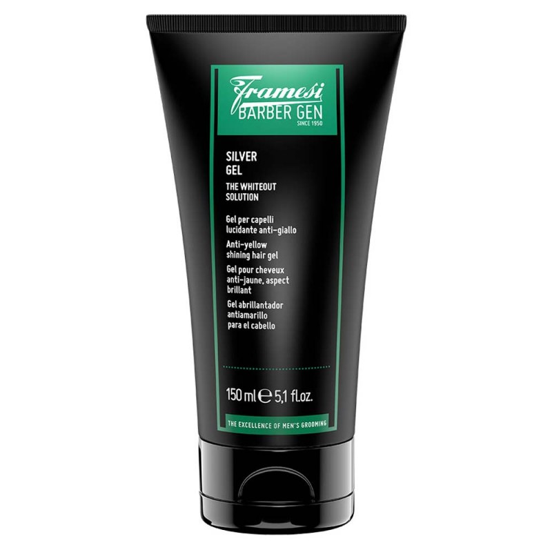 Framesi Barber Gen Silver Gel è un gel per capelli lucidante, a fissaggio naturale. Maschera i capelli bianchi e svolge un'azione idratante e anti-giallo.Si elimina facilmente con un semplice shampoo. Ideale per capelli grigi e bianchi.
