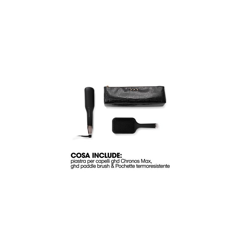 Celebra la bellezza senza tempo con il nuovo ghd Chronos Max festive gift set, progettato appositamente per capelli lunghi, folti o ricci. In questa edizione esclusiva troverai la piastra a piastre larghe più avanzata di ghd, accompagnata dall'All-Rounder Paddle Brush e da una raffinata custodia termoresistente: tutto ciò che serve per dominare anche le chiome più esigenti con facilità e velocità. La custodia termoresistente deve essere utilizzata esclusivamente con prodotti ghd.