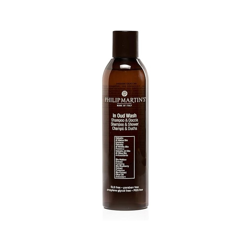Philip Martin's In Oud Wash è uno shampoo/doccia adatto alla detersione quotidiana dei capelli e della pelle del corpo. La sua texture contiene tensioattivi di origine vegetalle e permette di detergere ed eliminare ogni tipo d'impurità sulla pelle e il cuoio capelluto. Contiene dei principi nutritivi tra cui l'estratto di Olio di Oliva Bio, Malva Bio e Mirtillo, lascia la pelle profumata dalle raffinate note legnose e speziate della resina di Agarwood, tipiche della sensuale e misteriosa tradizione olfattiva mediorientale. In Oud Wash è lo shampoo doccia sensoriale che celebra il benessere sul corpo.