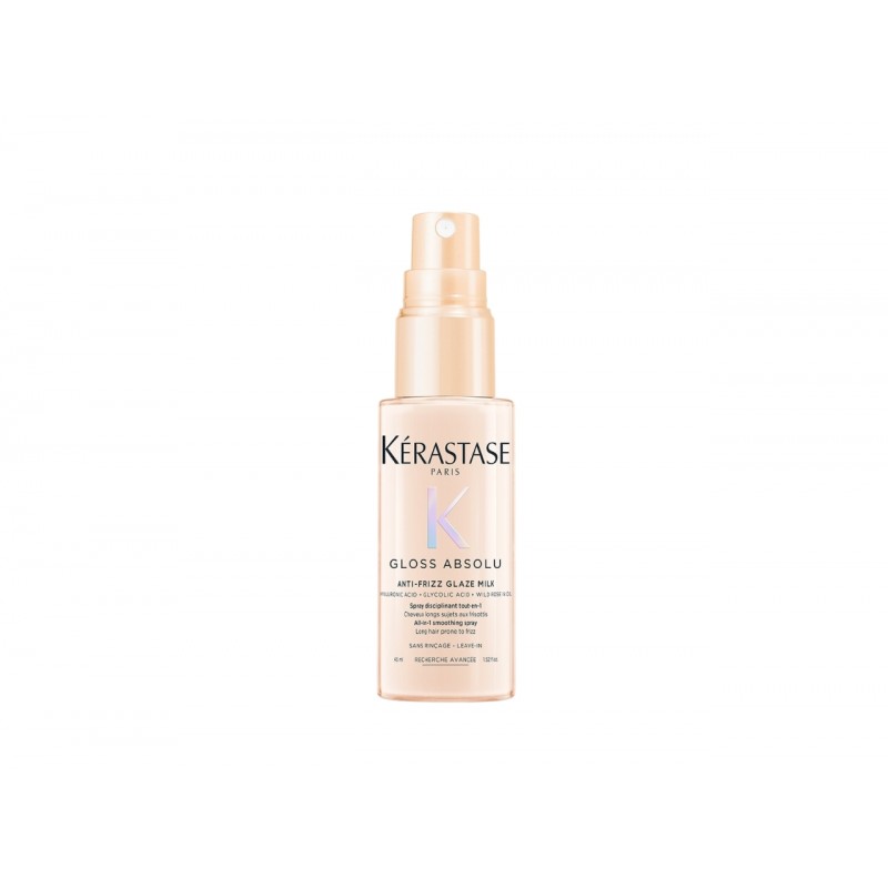 Kerastase Gloss Absolu Anti-Frizz Glaze Milk è uno spray levigante tutto-in-uno per capelli lunghi tendenti al crespo. La sua texture leggera districa istantaneamente, idrata e leviga la fibra facilitando l'asciugatura. Contiene acido ialuronico, acido glicolico e olio di rosa canina che elimina l'effetto del crespo levigando il capello rendendolo più lucido con effetto specchio. Protegge dai danni del calore fino a 230° e dall'umidità. Capelli morbidi, luminosi e setosi. Senza risciacquo.