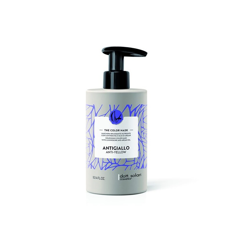 dott. solari COSMETICS The Color Mask Anti-Yellow è una maschera anti-giallo formulata per neutralizzare i riflessi gialli indesiderati su capelli bianchi, grigi, decolorati o biondi freddi. Grazie ai pigmenti viola ad azione mirata, riequilibra il tono della fibra capillare, esaltando la purezza del colore e mantenendo la luminosità naturale. Contiene con estratto di Argan, estratto di Camomilla e Luminescina, nutre in profondità e dona morbidezza e brillantezza.
