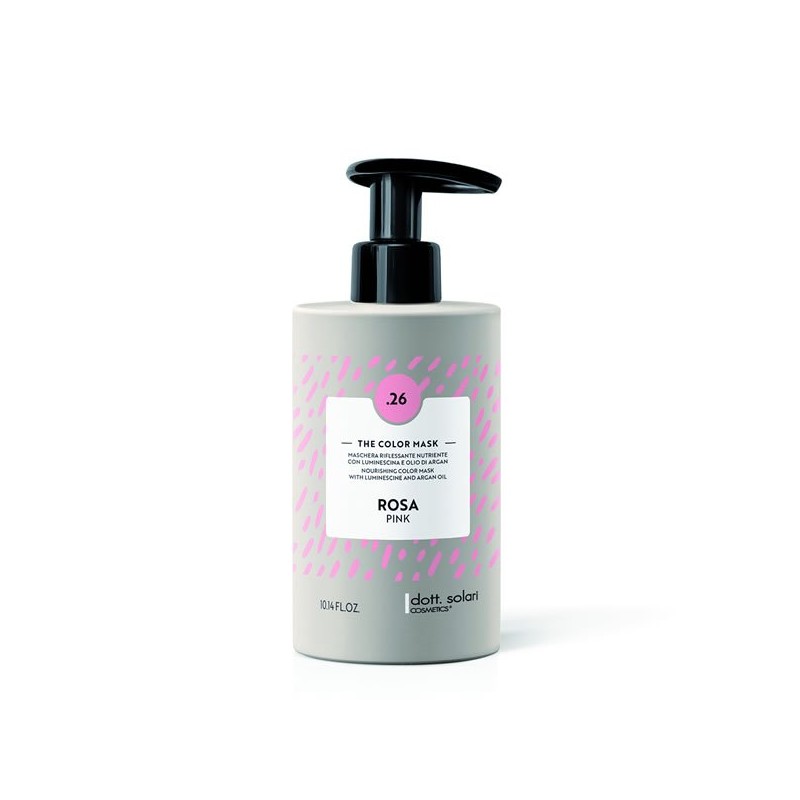 dott. solari COSMETICS The Color Mask Pink è una maschera riflessante e nutriente arricchita con pigmenti diretti, ideale per ravvivare e intensificare il colore dei capelli. La sua formula arricchita con estratto di Argan, estratto di camomilla e pantenolo nutre i capelli in profondità, donando brillantezza e contribuendo a mantenere viva l'intensità dei riflessi, sia su capelli naturali che colorati, tra un trattamento e l'altro. Su capelli naturali, dona nuova luminosità e vitalità esaltando il colore naturale. Adatta per creare vivaci effetti moda.
