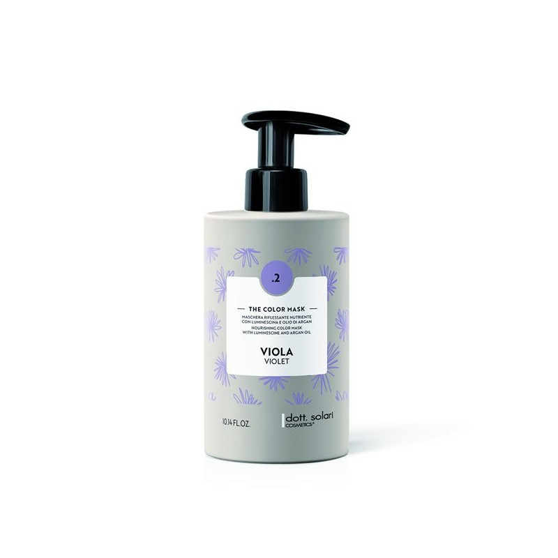dott. solari COSMETICS The Color Mask Violet è una maschera riflessante e nutriente arricchita con pigmenti diretti, ideale per ravvivare e intensificare il colore dei capelli. La sua formula arricchita con estratto di Argan, estratto di camomilla e pantenolo nutre i capelli in profondità, donando brillantezza e contribuendo a mantenere viva l'intensità dei riflessi, sia su capelli naturali che colorati, tra un trattamento e l'altro. Su capelli naturali, dona nuova luminosità e vitalità esaltando il colore naturale. Adatta per creare vivaci effetti moda.